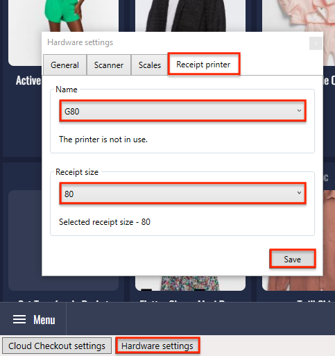 - В поле «Receipt size» выберите размер чековой ленты: